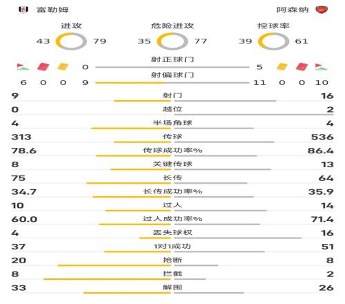 威胁进攻次数方面,阿森纳全场77次,富勒姆则为35次。角球数据,阿森纳10次,富勒姆6次。